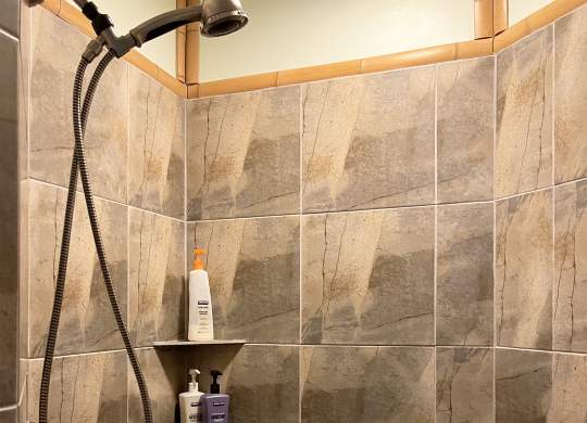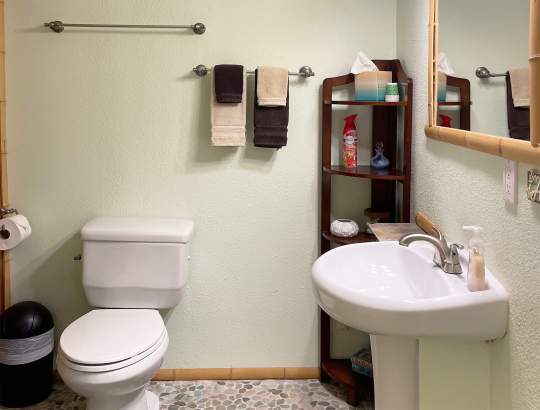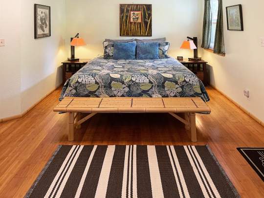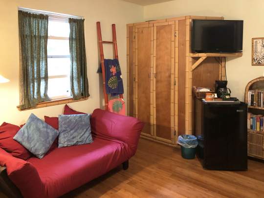 Enjoy a touch of the exotic in our bamboo accented room located on the lower level that features its own entrance and a private bathroom with river rock flooring and walk in shower. The Bamboo Room has a sitting area with a view of the lush tropical landscaping and includes a refrigerator, couch, microwave, coffee maker, air conditioner, picnic basket with utensils wine glasses, etc, and flat screen TV. This room features a queen sized bed.